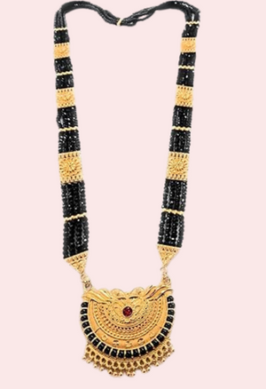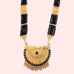 The Traditional Gold Plated Pahadi Mangalsutra is a classic piece of jewelry that reflects the rich heritage of the Pahadi region. Made with gold plating, this Mangalsutra features traditional design elements, making it ideal for weddings and special occasions. Its elegant and timeless style adds a touch of cultural charm to your look. This Mangalsutra is perfect for those who want to embrace traditional beauty while enjoying the sophistication of gold-plated jewelry.